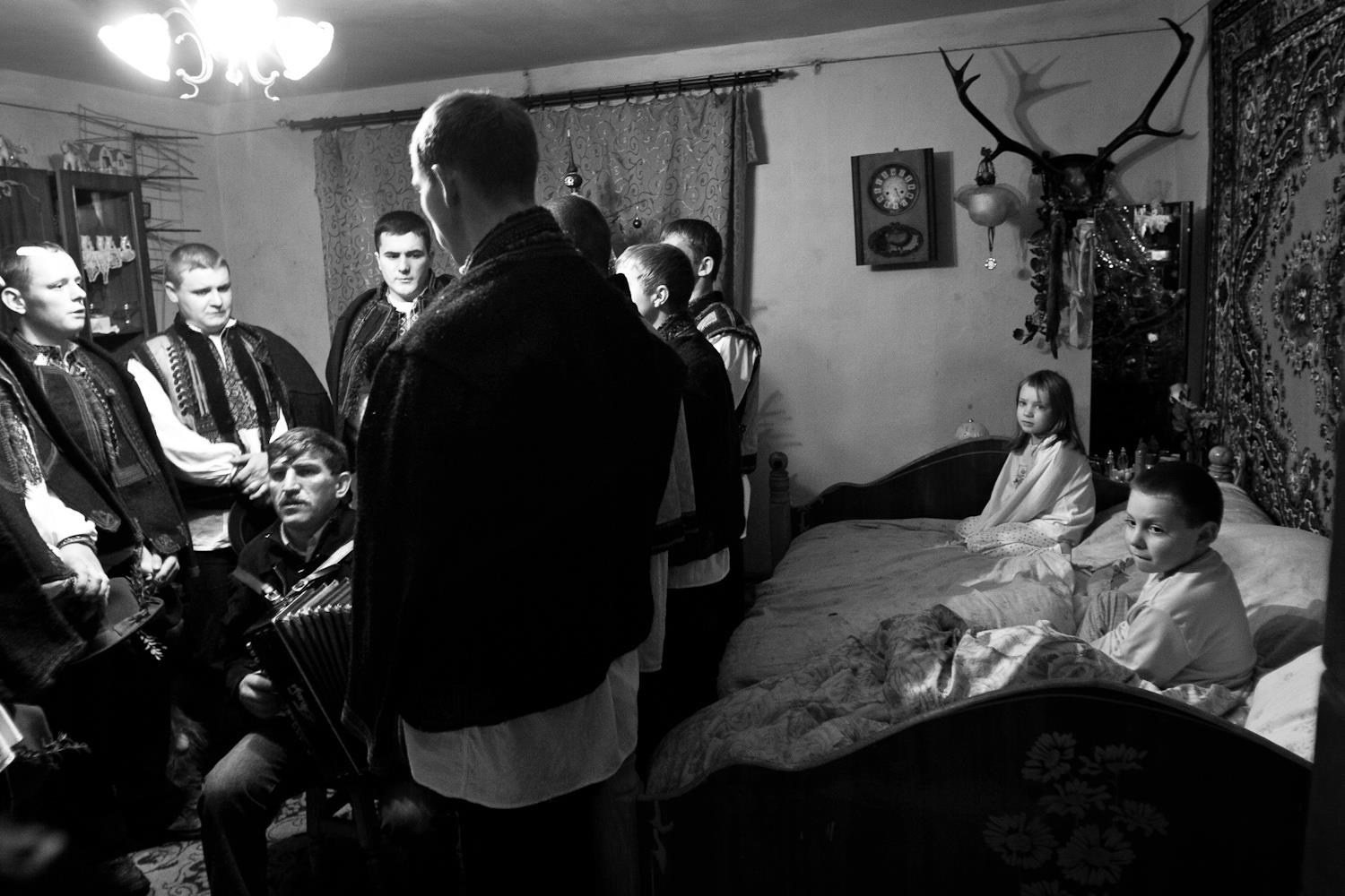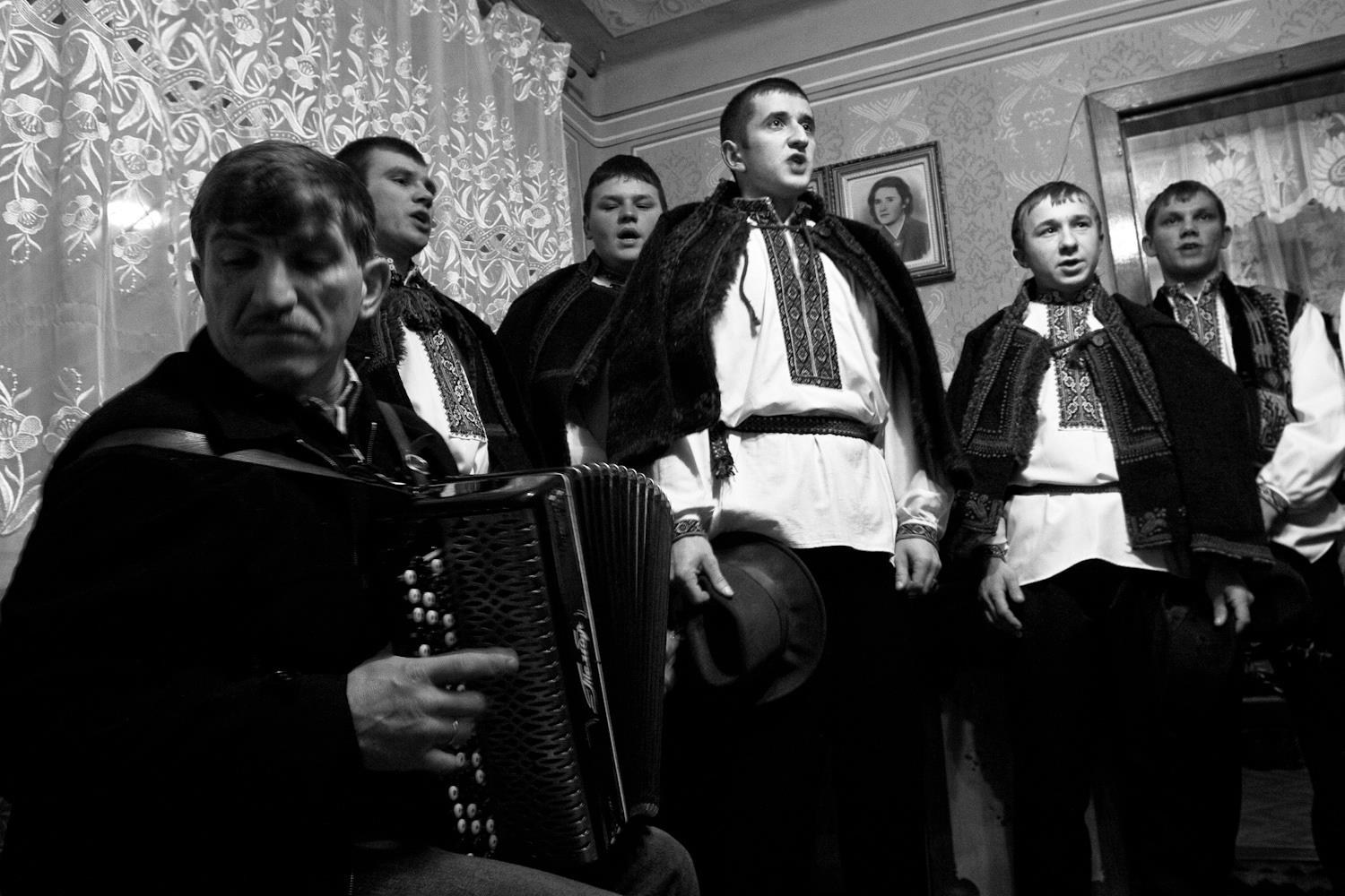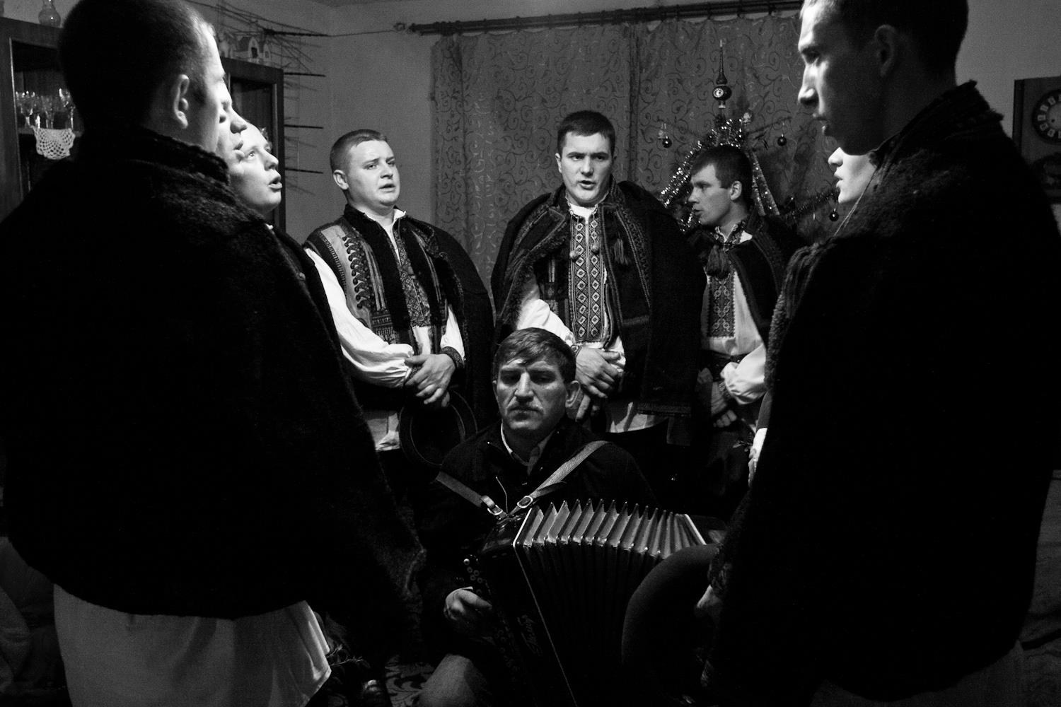 В городе Рахов (Закарпатье) колядки сохраняют древнюю силу и красоту. В морозные рождественские дни 2007 и 2008 года мужчины и мальчики в традиционных одеждах обходили дома с песнями, звонкими трещотками и факелами. Их пение звучало как живое продолжение старинного обряда, где прошлое и настоящее соединяются в едином хоре — гимне свету, рождению и надежде.